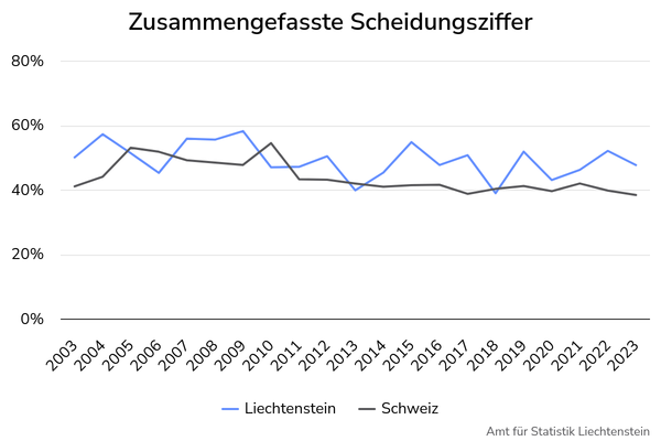 Die Scheidungen in Liechtenstein werden durch das Zivilstandsamt im Register eingetragen und beziehen sich nur auf Personen der ständigen Bevölkerung Liechtensteins. Die Scheidungsrate definiert sich als das Verhältnis der mittleren Anzahl der Ehescheidungen von Männern und Frauen zu der mittleren Anzahl der Eheschliessungen von Männern und Frauen im gleichen Jahr. Dieser Wert liegt im Jahr 2024 in Liechtenstein bei 49.6%. Allerdings ist das Zusammenspiel der beiden Werte zu berücksichtigen: Sinken die Eheschliessungen, steigt die Scheidungsrate automatisch. Damit ist die Scheidungsrate nur begrenzt aussagekräftig, wenn es darum geht einzuschätzen, ob neue Ehen tatsächlich halten.