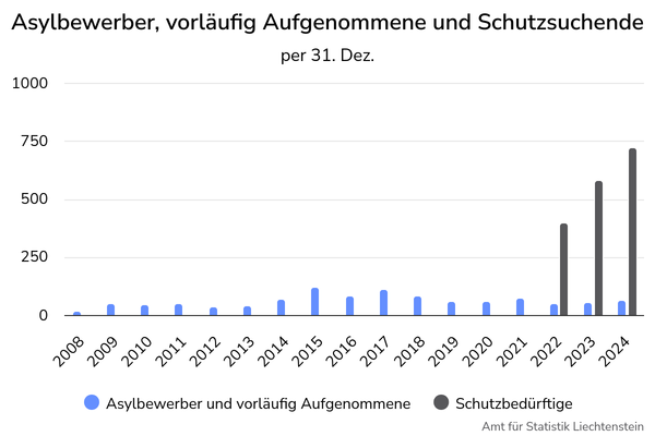 Die Asylzahlen des Jahres 2024 waren weiterhin stark von den Folgen der russischen Invasion der Ukraine im Februar 2022 geprägt. Zur Bewältigung der hohen Gesuchszahlen wurde erstmals seit dem Jugoslawien-Krieg eine Verordnung zur Anordnung der vorübergehenden Schutzgewährung erlassen. Durch diese erhalten alle Personen, die zu der in der Verordnung definierten Gruppe gehören, seit Mitte März 2022 ein befristetes Aufenthaltsrecht in Liechtenstein. Seit dem Erlass der Verordnung wurden insgesamt 1’125 Schutzgesuche gestellt.