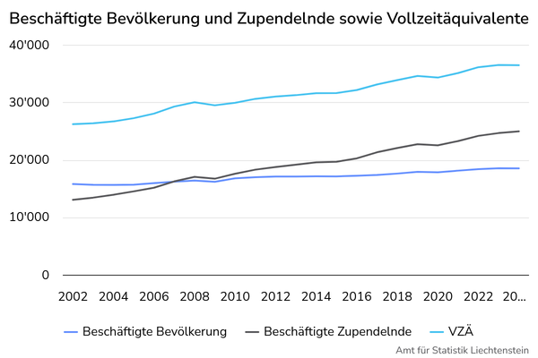 Am 31. Dezember 2024 zählte die ständige Bevölkerung in Liechtenstein 40’886 Personen. Gleichzeitig arbeiteten in Liechtenstein 43’441 Personen, woraus ein Verhältnis von Beschäftigten zur ständigen Bevölkerung von 106% resultiert. Im europäischen Vergleich verzeichnet Luxemburg das zweithöchste Verhältnis (76%), gefolgt von der Schweiz (63%), Deutschland (55%) und Österreich (49%). In Liechtenstein und Luxemburg waren die Anteile der Zupendelnden mit 57.4% und 45.5% sehr hoch. In der Schweiz betrug er lediglich 7.1%. Es gilt zu berücksichtigen, dass ein Ländervergleich aufgrund unterschiedlicher Erhebungsmethoden nur begrenzte Aussagekraft hat.
