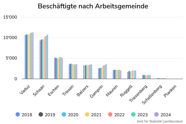 Die grösste prozentuale Zunahme gegenüber 2023 weist mit 7.0% auf 169 Beschäftigte die Gemeinde Schellenberg auf. An zweiter Stelle folgt Gamprin mit einem Zuwachs von 6.3% auf 3'685 Beschäftigte. In Schaan (+2.8%), Balzers (+1.4%) und Vaduz (+0.9%) stieg die Beschäftigtenzahl innerhalb des letzten Jahres ebenfalls leicht an. Im Gegenzug waren in den Gemeinden Mauren (-5.8%), Triesenberg (-4.2%), Eschen (-2.8%), Planken (-1.4%), Triesen (-1.3%) und Ruggell (-1.1%) per 31. Dezember 2024 weniger Beschäftigte registriert als im Vorjahr. Es soll jedoch darauf hingewiesen werden, dass in den Gemeinden Schellenberg und Planken aufgrund der tiefen Anzahl an Beschäftigten von weniger als 200 naturgemäss grössere prozentuale Schwankungen möglich sind.