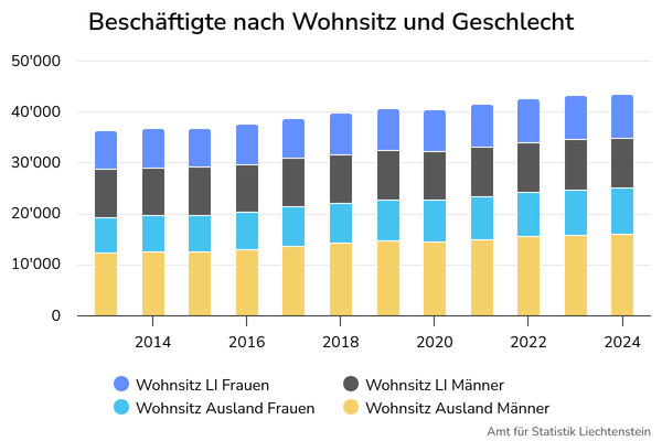Im Berichtsjahr 2024 war ein Zuwachs der Beschäftigten in Liechtenstein von 43’162 Personen im Vorjahr auf 43’441 Personen per 31. Dezember 2024 zu verzeichnen. Folglich sind 0.6% respektive 279 Beschäftigte mehr registriert. Mit Ausnahme eines Rückgangs im Jahr 2020, der auf Einschränkungen in Verbindung mit der Covid-19 Pandemie zurückzuführen war, stieg diese Zahl seit 2009 kontinuierlich an. Der Anstieg der Beschäftigten flacht jedoch seit zwei Jahren ab.