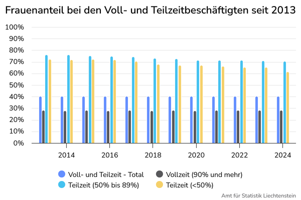 Seit 2013 hat sich bei Teilzeitarbeitsverhältnissen bis 50 Stellenprozenten der Frauenanteil um 10.9 Prozentpunkte auf 61.4% im Berichtsjahr reduziert. Bei Teilzeitarbeitenden mit 50 bis 89 Stellenprozenten reduzierte sich der Frauenanteil im gleichen Zeitraum um 5.6 Prozentpunkte auf 70.3% im Jahr 2024. Bei den Vollzeitarbeitsverhältnissen, d.h. 90 Stellenprozent und mehr, ist das Geschlechterverhältnis mit einem Frauenanteil zwischen 27.9% und 28.4% seit 2013 stabil.