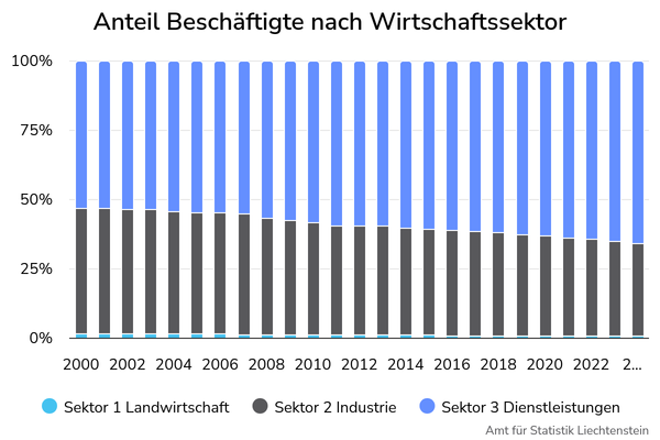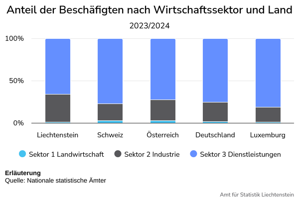 Die Anteile der Wirtschaftssektoren an der gesamten Beschäftigung fallen in den fünf Vergleichsstaaten Liechtenstein, Schweiz, Österreich, Deutschland und Luxemburg sehr unterschiedlich aus. Der Anteil der Beschäftigten im Sektor 1 Landwirtschaft fällt in Liechtenstein mit 0.6% und Luxemburg mit 0.7% am kleinsten aus. Die grössten Anteile der Beschäftigten im Sektor 1 werden mit 2.8% in Österreich und mit 2.6% in der Schweiz verzeichnet. Der Anteil der Beschäftigten im Industriesektor ist in Liechtenstein mit 33.4% am höchsten. Es folgen Österreich mit 24.8%, Deutschland mit 23.3%, die Schweiz mit 20.0% sowie Luxemburg mit 17.7%. Im Sektor 3 Dienstleistungen verfügt Luxemburg mit 81.6% über den grössten Anteil, gefolgt von der Schweiz mit 77.4%, Deutschland mit 75.5%, Österreich mit 72.3% und Liechtenstein mit 66.0% der Beschäftigten.