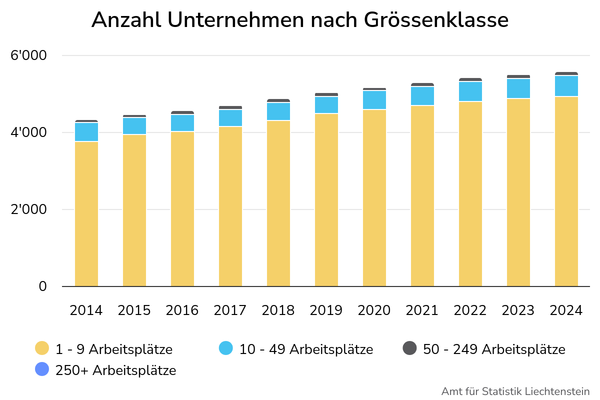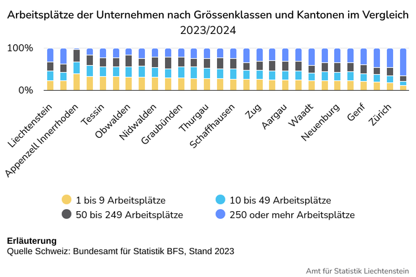 Betrachtet nach Grössenklasse des Unternehmens befinden sich 22.5% der Arbeitsplätze in Kleinstunternehmen mit 1-9 Arbeitsplätzen. 23.0% befinden sich in kleinen Unternehmen (10-49 Arbeitsplätze), 21.3% in mittleren Unternehmen (50-249 Arbeitsplätze) und 33.2% in Grossunternehmen (250 und mehr Arbeitsplätze). In der Schweiz (Werte für das Jahr 2023) ist der Anteil der Arbeitsplätze in Kleinstunternehmen mit 21.8% ähnlich wie in Liechtenstein. In Grossunternehmen sind in der Schweiz etwas mehr Arbeitsplätze zu finden (38.9%), während in kleinen und mittleren Unternehmen (19.5% respektive 19.8%) jeweils etwas geringere Anteile als in Liechtenstein zu finden sind.