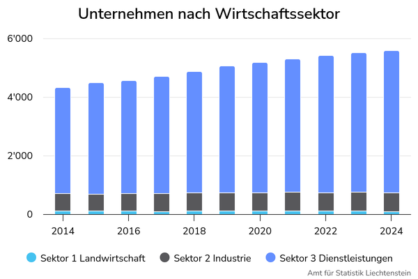 Von den am 31. Dezember 2024 insgesamt 5’582 in Liechtenstein gezählten Unternehmen waren 4’844 Unternehmen (86.8%) dem Sektor 3 Dienstleistungen, 644 Unternehmen (11.5%) dem Sektor 2 Industrie und 94 Unternehmen (1.7%) dem Sektor 1 Landwirtschaft zugeordnet.