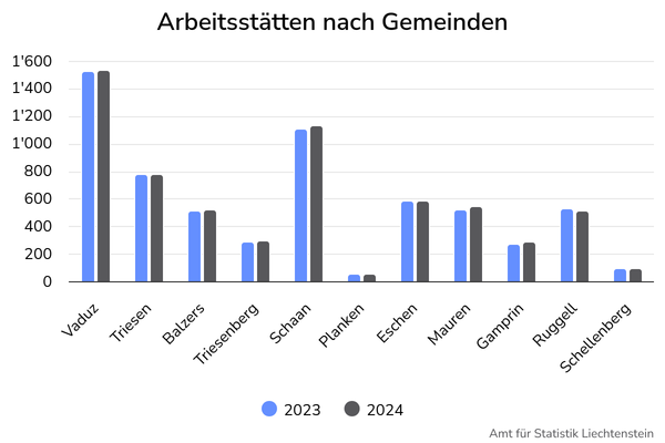 Die 46’364 (2023: 46’040) Arbeitsplätze verteilten sich am 31. Dezember 2024 auf 6’317 (2023: 6’250) Arbeitsstätten. Die meisten Arbeitsstätten, nämlich 24.3%, hatten ihren Standort in Vaduz. 17.9% aller Arbeitsstätten hatten ihren Standort in Schaan und 12.3% in Triesen. Somit befanden sich in diesen drei Gemeinden 54.4% (2023: 54.4%) der Arbeitsstätten Liechtensteins.
