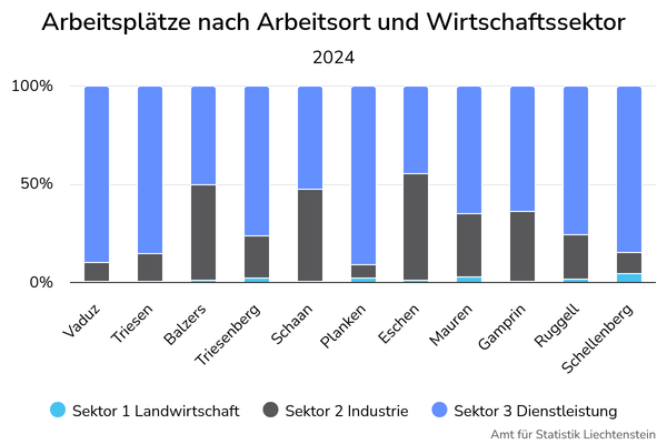 Die Anteile der Arbeitsplätze in den drei Wirtschaftssektoren unterscheiden sich in den elf Gemeinden teilweise deutlich. Der Anteil der Arbeitsplätze im Sektor 3 Dienstleistungen ist in den Gemeinden Planken mit 91.2% und Vaduz mit 90.0% am höchsten. In Vaduz ist mit 10'890 auch die grösste absolute Zahl von Arbeitsplätzen im Dienstleistungssektor vorhanden, während Planken mit lediglich 83 Arbeitsplätzen im Dienstleistungssektor trotz höchstem Anteil die tiefste absolute Zahl aufweist. In Eschen sind dagegen nur 45.0% der Arbeitsplätze dem Dienstleistungssektor zuzuordnen. In Balzers sind es 50.7%, in Schaan 52.9%. Diese Gemeinden weisen damit die tiefsten Anteile von Arbeitsplätzen im Sektor 3 Dienstleistungen auf. In allen übrigen Gemeinden liegt dieser Anteil bei deutlich über 60%.