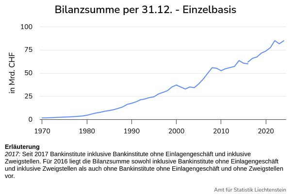 Die aggregierte Bilanzsumme der 10 Bankinstitute in Liechtenstein (Einzelbasis) belief sich per 31. Dezember 2024 auf CHF 84.8 Mrd. Gegenüber dem Vorjahr erhöhte sich die Bilanzsumme um CHF 3.2 Mrd. bzw. 4.0%. Im Jahr 2023 betrug die Bilanzsumme der damals 11 Bankinstitute CHF 81.5 Mrd. Von 2018 bis 2022 ist die Bilanzsumme, trotz der Abnahme der Anzahl Bankinstitute von 15 auf 12, stetig angestiegen. Nach einem Rückgang im Vorjahr nahm die Bilanzsumme im Berichtsjahr wieder zu.