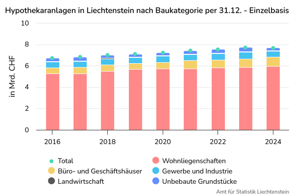 Per 31. Dezember 2024 wiesen die Banken auf Einzelbasis Forderungen gegenüber Kunden (Kredite, Hypotheken) von CHF 31.9 Mrd. aus. Dies entspricht 37.7% der Aktiven. Davon waren CHF 15.1 Mrd. Hypothekarforderungen. Die inländischen Hypothekarforderungen der Banken in Liechtenstein beliefen sich auf CHF 7.7 Mrd. Im Vergleich zum Vorjahr nahmen die Hypothekarforderungen in Liechtenstein um CHF 44.3 Mio. bzw. 0.6% ab. 77.4% der Hypothekarforderungen in Liechtenstein entfielen auf Wohnliegenschaften.