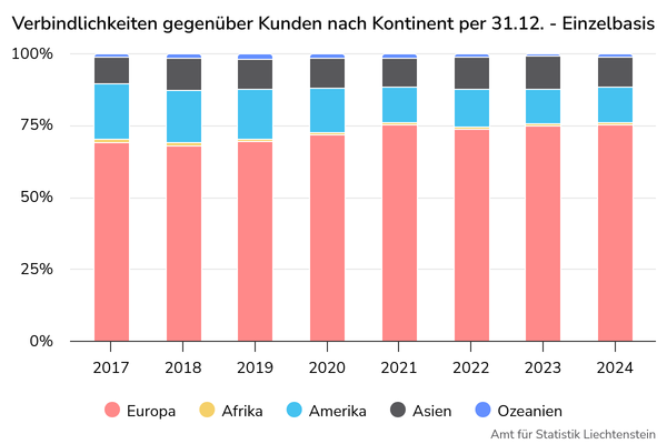Die Bankinstitute (Einzelbasis) wiesen per 31. Dezember 2024 CHF 49.4 Mrd. an Verbindlichkeiten gegenüber Kunden (Kundeneinlagen wie Sparkonti, Geldmarktkonti und andere Konti) auf. Dies entspricht 46.9% der Passiven. Von den Einlagen (Verbindlichkeiten gegenüber Kunden) stammten 75.2% von Kunden aus Europa. An zweiter Position lagen die Einlagen von Kunden aus Amerika mit 12.5%. Die Einlagen von Kunden aus Asien machten 10.6% der Verbindlichkeiten gegenüber Kunden aus. Seit 2017 hat sich der Anteil der Einlagen von Kunden aus Amerika von 19.3% auf 12.5% reduziert.