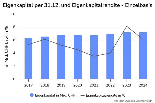Die Bankinstitute (Einzelbasis) verfügten per Ende 2024 über Eigenkapital von CHF 7.22 Mrd. Im Vergleich zum Vorjahr nahm das Eigenkapital nur geringfügig um CHF 3.0 Mio. bzw. 0.0% ab. In den letzten fünf Jahren (2019-2023) betrug das Eigenkapital durchschnittlich CHF 6.89 Mrd.