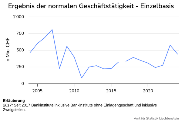 Das Ergebnis der normalen Geschäftstätigkeit lag im Jahr 2024 für die Bankinstitute (Einzelbasis) bei CHF 440.5 Mio. Im Vergleich zum Vorjahr nahm es um CHF 133.0 Mio. ab. Im Vorjahr hatte es CHF 573.5 Mio. betragen. Es lag höher als der Durchschnitt der letzten fünf Jahre (2019-2023) in denen es durchschnittlich CHF 346.9 Mio. betragen hatte. Das Ergebnis der normalen Geschäftstätigkeit stellt das Ergebnis vor der Berücksichtigung von ausserordentlichen Aufwänden bzw. Erträgen, Steuern sowie Zuführungen zu den Rückstellungen bzw. Erträgen aus der Auflösung von Rückstellungen für allgemeine Bankrisiken dar.