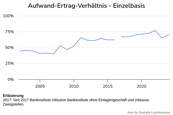 Für die Berechnung des Aufwand-Ertrag-Verhältnisses (Cost-Income-Ratio) werden die im Geschäftsjahr angefallenen Geschäftsaufwände ins Verhältnis zu den Gesamterträgen der Banken gesetzt. Grundsätzlich gilt, je geringer die Cost-Income-Ratio ausfällt, desto effizienter wirtschaften die Banken. Bei einem Geschäftsaufwand von CHF 1.44 Mrd. und einem Gesamtertrag von CHF 2.03 Mrd. ergab sich für das Jahr 2024 eine Cost-Income-Ratio von 70.6% (Einzelbasis). Im Vorjahr betrug die Cost-Income-Ratio 65.2%. In den letzten fünf Jahren (2019-2023) hatte die Cost-Income-Ratio durchschnittlich bei 71.0% gelegen. Damit hat sich die Cost-Income-Ratio im Vergleich zum Vorjahr verschlechtert, lag aber ungefähr im Durchschnitt der letzten fünf Jahre.