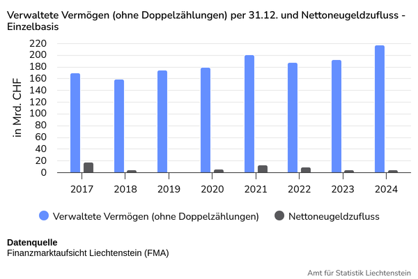 Die gesamten in Liechtenstein verwalteten Kundenvermögen betrugen auf Einzelbasis per 31. Dezember 2024 CHF 217.3 Mrd. (ohne Doppelzählungen). Im Jahr 2024 konnte ein Neugeldzufluss von CHF 3.7 Mrd. verzeichnet werden.