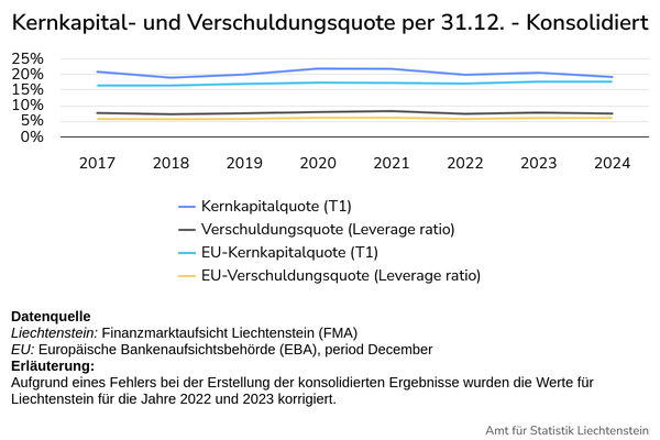 Die Kernkapitalquote (Tier 1 Capital Ratio) betrug Ende Jahr 2024 in der konsolidierten Betrachtung (Bankinstitute inklusive Tochtergesellschaften) 19.0%. Die Verschuldungsquote (Leverage Ratio) belief sich Ende Jahr 2024 konsolidiert betrachtet auf 7.3%. Gemäss Europäischer Bankenaufsicht (EBA) lag die Kernkapitalquote für die europäischen Banken im Dezember 2024 durchschnittlich bei 17.5% und die Verschuldungsquote bei 5.9%. Somit war sowohl die Kernkapitalquote als auch die Verschuldungsquote überdurchschnittlich im Vergleich zu den europäischen Banken.