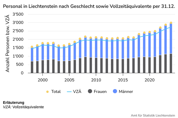 Der Personalbestand in Liechtenstein betrug für die Bankinstitute per 31. Dezember 2024 gemäss Liechtensteinischem Unternehmensregister des Amtes für Statistik 2'985 Voll- und Teilzeitbeschäftige. Davon waren 38.6% Frauen. Zur Ermittlung der sogenannten Vollzeitäquivalente, die eine bessere Vergleichbarkeit der Beschäftigtenzahlen ermöglichen, werden die Teilzeitstellen auf Vollzeitstellen umgerechnet. Die Umrechnung per Ende 2024 ergab 2'728 Vollzeitäquivalente. Im Jahr 2023 waren es 2'869 Beschäftige und 2'621 Vollzeitäquivalente gewesen. Seit 2018 ist ein stetiger Anstieg der Vollzeitäquivalente zu beobachten. Im Vergleich zu 1998 haben die Vollzeitäquivalente um über 80% zugenommen.