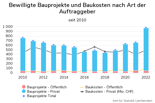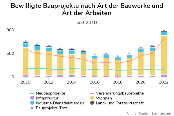 Das Amt für Hochbau und Raumplanung erteilte im Jahr 2022 insgesamt 979 Baubewilligungen bzw. Baufreigaben. Im Vergleich zum Vorjahr (660) bzw. dem Mittelwert der vorangegangenen fünf Jahre (2017-2021: 540) war ein deutlicher Anstieg der Zahl der erteilten Bewilligungen zu verzeichnen. Der Anstieg ist auf die hohe Zahl von 820 bewilligten Veränderungsbauprojekten zurückzuführen.