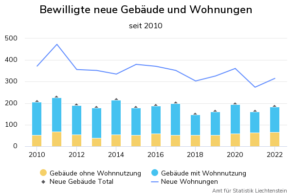 Von den im Berichtsjahr bewilligten 315 Wohnungen waren 304 in Neubauprojekten und 11 in Veränderungsbauprojekten vorgesehen. Nach Gemeinden entfielen 64 auf Vaduz, 57 auf Eschen, 41 auf Balzers, 39 auf Triesen, 36 auf Schaan, 24 auf Mauren, 15 auf Gamprin, 14 auf Triesenberg, 12 auf Ruggell, 10 auf Schellenberg und 3 auf Planken. Bezogen auf die Einwohnerzahl wurden im Unterland 8.2 neue Wohnungen pro 1000 Einwohner (14401 Personen, 118 Wohnungen) und im Oberland 7.9 neue Wohnungen pro 1000 Einwohner (25043 Personen, 197 Wohnungen) bewilligt. Landesweit waren es 8.0 neue Wohnungen pro 1000 Einwohner (Quelle Bevölkerungszahlen: Bevölkerungsstand per 30. Juni 2022, publiziert am 23.12.2022).