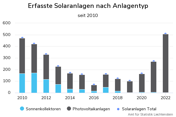 Neue Solaranlagen an Gebäuden werden in der Baustatistik seit dem Jahr 1995 ausgewiesen. Für das Jahr 2022 wurden im Gebäude- und Wohnungsregister insgesamt 506 neue Solaranlagen erfasst. Die Zahl der neuen Solaranlagen erreichte damit nach zehn Jahren mit tieferen Zahlen wieder das Niveau der Jahre 2009 bis 2011, als jeweils über 400 Anlagen erfasst worden waren.