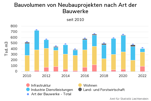 Betrachtet nach der Art der Bauwerke war im Berichtsjahr allerdings im Bereich Infrastruktur eine hohe Gesamtkubatur der Neubauten zu verzeichnen. Mit 94700 m3 wurde der zweithöchste Wert seit dem Beginn der Zeitreihe im Jahr 2010 registriert. Im Mittel der Jahre 2017-2021 war für Neubauten im Bereich Infrastruktur ein Volumen von 39100 m3 geplant gewesen.