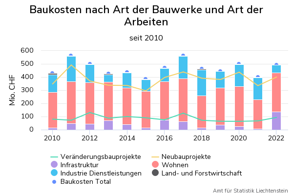 Insgesamt wurden im Wohnbau Investitionen von CHF 295.9 Mio. projektiert, 34% mehr als im Vorjahr (CHF 220.6 Mio.) und 8% mehr als im Mittel der Jahre 2017-2021 (CHF 275.2 Mio.). Im Bereich Infrastruktur wurden Investitionen von CHF 136.4 Mio. projektiert, der höchste Wert der bis 2010 reichenden Zeitreihe und mehr als das Vierfache des Durchschnitts der Jahre 2017-2021 von CHF 30.4 Mio. In den Bereichen Industrie und Dienstleistungen sowie Land- und Forstwirtschaft waren hingegen deutlich tiefere Investitionen als in den Vorperioden geplant. Die Werte von CHF 59.4 Mio. respektive CHF 1.2 Mio. waren jeweils die tiefsten seit vielen Jahren.