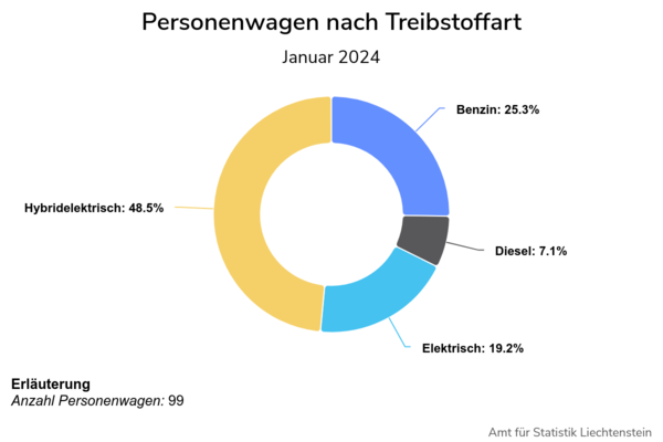 20.02.2024 - Im Januar 2024 wurden insgesamt 145 fabrikneue Fahrzeuge, davon 99 Personenwagen, vom Amt für Strassenverkehr erstzugelassen.