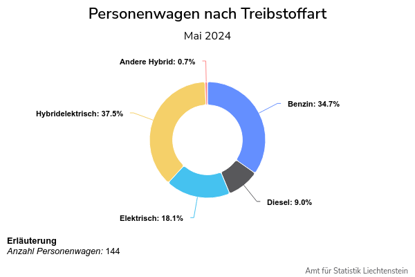26.06.2024 - Im Mai 2024 wurden insgesamt 215 fabrikneue Fahrzeuge, davon 144 Personenwagen, vom Amt für Strassenverkehr erstzugelassen.