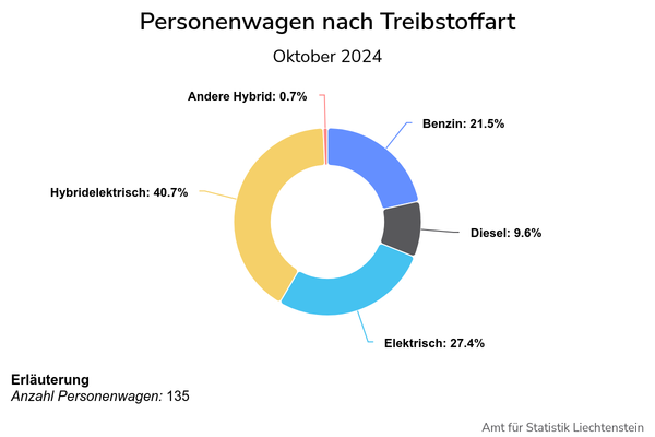 22.11.2024 - Im Oktober 2024 wurden insgesamt 173 fabrikneue Fahrzeuge, davon 135 Personenwagen, vom Amt für Strassenverkehr erstzugelassen.