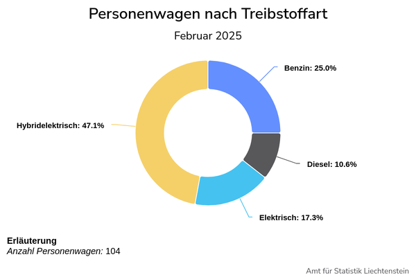 17.03.2025 - Im Februar 2025 wurden insgesamt 150 fabrikneue Fahrzeuge, davon 104 Personenwagen, vom Amt für Strassenverkehr erstzugelassen.