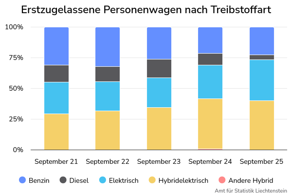 17.10.2025 - Im September 2025 wurden insgesamt 168 fabrikneue Fahrzeuge, davon 123 Personenwagen, vom Amt für Strassenverkehr erstzugelassen.
