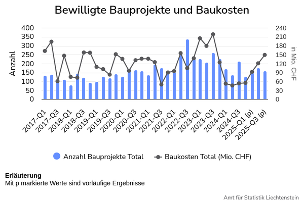 Zahlen zur Bautätigkeit in Liechtenstein basieren auf den vom Amt für Hochbau und Raumplanung erteilten Baubewilligungen bzw. Baufreigaben. Provisorische Quartalszahlen werden viermal jährlich 2 Monate nach Quartalsende veröffentlicht, die definitiven Zahlen jährlich 5 Monate nach Jahresende.