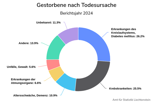 14.11.2025 – Im Jahr 2024 sind insgesamt 302 Personen verstorben. Die Haupttodesursache waren 2024 Erkrankungen des Kreislaufsystems (inklusive Diabetes mellitus). Insgesamt 79 Personen (26%) der Verstorbenen wiesen diese Todesursache auf. 77 Personen (25%) verstarben an Krebskrankheiten. Ebenso waren die Altersschwäche inklusive Demenz mit 11% sowie Erkrankungen der Atmungsorgane mit 7% relativ häufige Todesursachen. In 17 Fällen war die Todesursache «Unfälle oder Gewalt» (6%), wobei es sich dabei in vier Fällen um Suizid handelte.