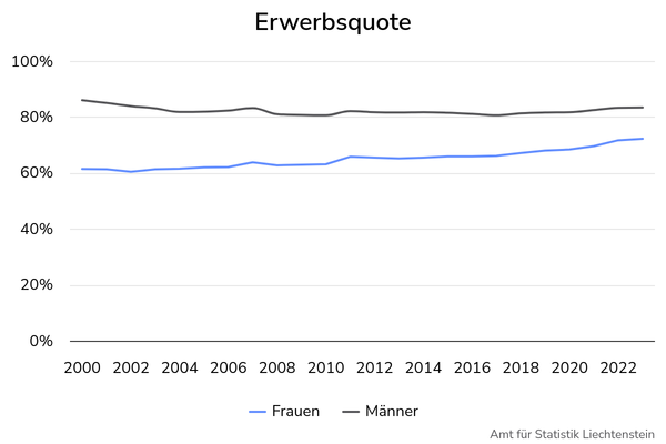 Die Erwerbsquote der Frauen zeigt während des dargestellten Zeitraums seit dem Jahr 2000 einen Aufwärtstrend, die der Männer einen fluktuierenden Verlauf. Die Erwerbsquoten der Frauen und Männer nähern sich weiter an. Für das Jahr 2023 lässt sich eine Erwerbsquote von 72.2% für die Frauen und von 83.4% für die Männer festhalten. Im Vorjahresvergleich erhöht sich die Erwerbsquote beider Geschlechter.