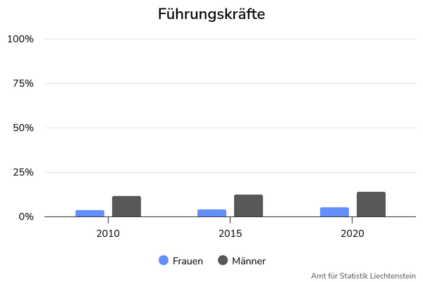 Der Anteil der erwerbstätigen Bevölkerung in Führungspositionen ist seit 2010 kontinuierlich angestiegen. Während 2010 3.6% der weiblichen Erwerbstätigen Führungspositionen inne hatten, sind es 2020 5.4%. Auch bei den Männern ist ein Wachstum zu verzeichnen, welches aber zwischen 2010 und 2020 mit 2.5 Prozentpunkten grösser ist als jenes der Frauen im selben Zeitraum. Das Wachstum auf weiblicher Seite liegt bei 1.6%. Im Jahr 2020 war der Anteil der erwerbstätigen Männer in Führungspositionen mehr als 2.5 mal so hoch, wie der Anteil der erwerbstätigen Frauen in Führungspositionen.
