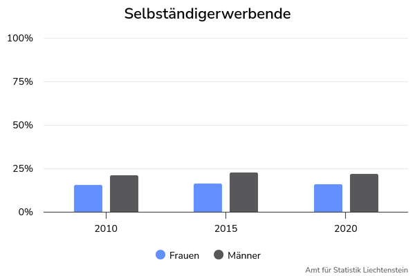 Die Selbständigenquote blieb zwischen 2010 und 2020 beinahe unverändert. Sie stieg im dargestellten Zeitraum von 18.9% auf 19.3%. Im Jahr 2020 waren damit insgesamt 3'986 Personen selbstständig, in eigener Kapitalgesellschaft angestellt oder als Mitarbeitende im Betrieb des Familienmitgliedes erwerbstätig. Dabei zeigt über den dargestellten Zeitraum hinweg jeweils ein höherer Anteil bei den Männern. 2020 sind 22.1% der männlichen Erwerbstätigen und 16.1% der weiblichen Erwerbstätigen selbstständigerwerbend tätig. Bei beiden Geschlechtern ist eine Zunahme seit 2010 zu verzeichnen. Bei den Frauen sind es 0.4 Prozentpunkte und bei den Männern 0.7. Vergleicht man die Zahlen hingegen mit den Angaben aus 2015, zeigt sich seither eine leichte Abnahme der Anteile.