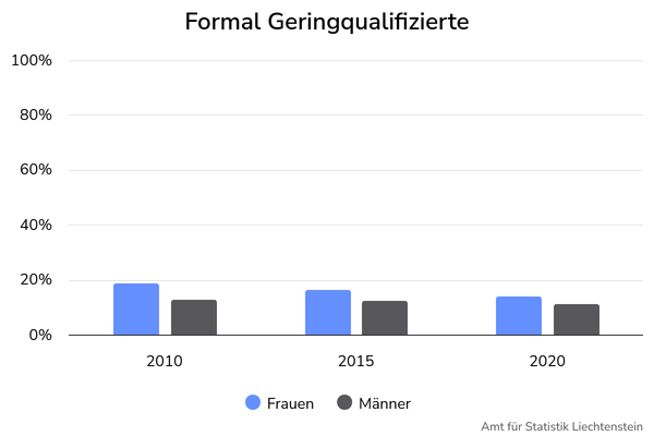 Der Anteil der Liechtensteiner Bevölkerung zwischen 20 und 64 Jahren, die über keine Ausbildung verfügen oder deren höchste Ausbildung die obligatorische Schule ist, hat seit 2010 abgenommen. Während der Anteil 2010 noch bei 15.9% lag, reduzierte sich der Anteil der Gesamtbevölkerung auf 12.6% im Jahr 2020. Der Anteil Frauen mit maximal obligatorischem Schulabschluss ist jeweils höher als der Anteil der Männer. Im Jahr 2020 besassen 1’353 Männer (11.3%) und 1’682 Frauen (13.9%) der ständigen Bevölkerung als höchsten Abschluss den obligatorischen Schulabschluss. Der Frauenanteil reduzierte sich von 18.8% im Jahr 2010 auf 13.9% im Jahr 2020.
