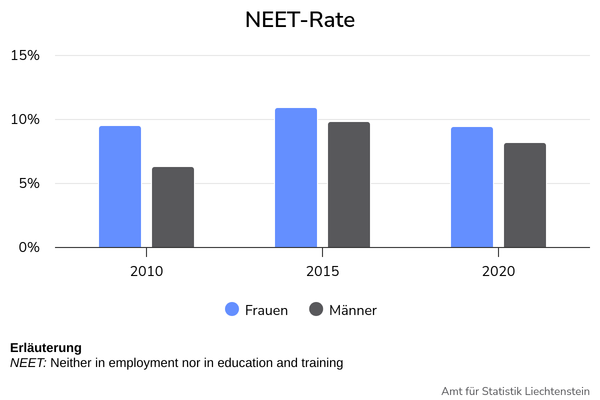 Die NEET-Rate erreicht 2020 in Liechtenstein ein Total von 8.8%. Während für die Männer eine Rate von 8.2% festgestellt werden kann, sind es für die Frauen 9.4%. 2020 entspricht dies 299 Frauen und 266 Männer im Alter zwischen 15 und 29 Jahren, die weder einer Erwerbsarbeit nachgehen noch in Ausbildung sind. Auch in den Vorjahren zeigt sich eine höhere Rate für Frauen. Zwischen 2010 und 2015 hat sich die Differenz von 3.3 auf 1.1 Prozentpunkte verringert. Seither ist der Unterschied nahezu konstant geblieben.