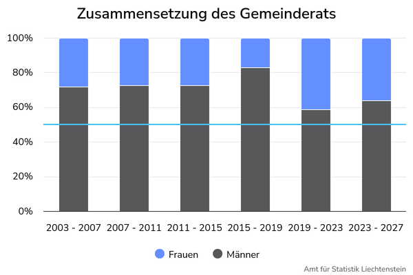 Eine nachhaltige Entwicklung beinhaltet eine Entscheidungsfindung, die auf allen Ebenen bedarfs-orientiert, inklusiv, partizipatorisch und repräsentativ ist (SDG 16.7). Dazu gehören die volle und wirksame Teilhabe von Frauen und ihre Chancengleichheit bei der Übernahme von Führungsrollen auf allen Ebenen der Entscheidungsfindung im politischen, wirtschaftlichen und öffentlichen Leben (SDG 5.5). In der liechtensteinischen Politik sind Frauen meist unterrepräsentiert (Regierungsbericht 2019). Eine angemessene Vertretung von Frauen in politischen Organen fördert den Einbezug der Geschlechterperspektive in politische Entscheidungen, was für die Realisierung der Gleichstellung zwischen Frau und Mann auf Gemeindeebene von Bedeutung ist. Ein ausgewogenes Verhältnis von Männern und Frauen unter den Gemeinderatsmitgliedern ist für die politische Repräsentanz der Frauen und Männer deshalb von Relevanz.