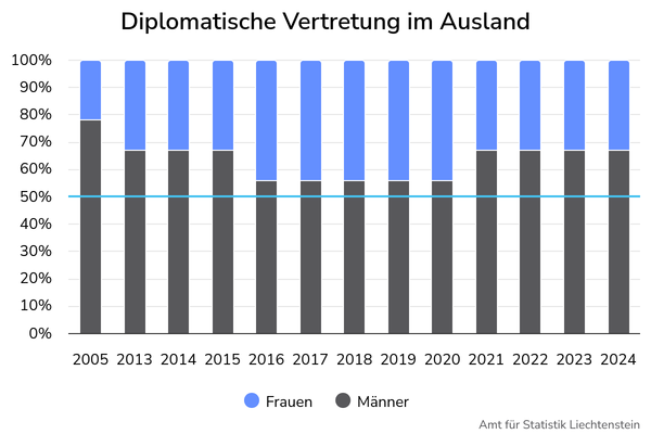 Der Frauenanteil unter den Liechtensteiner Botschafter/innen – insgesamt werden 9 Stellen gezählt – hat sich von 2005 auf 2016 von 2 Botschafterinnen auf 4 Botschafterinnen und einem entsprechenden Anteil von 44% erhöht. Dieser Anteil blieb bis 2020 konstant. Ab 2021 ist ein Rückgang der weiblichen Vertretungen zu beobachten und die Frauenquote wird seither mit 33.3% berechnet.
