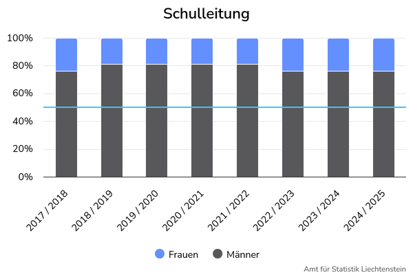Der Indikator zeigt den Anteil der Frauen und den Anteil der Männer unter den Schulleitenden am Total der Schulleitenden an allgemeinbildenden, öffentlichen und privaten Liechtensteiner Pflichtschulen an.