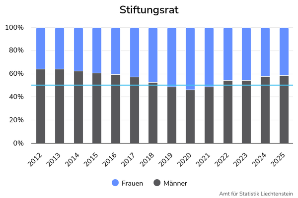 Der Indikator zeigt den Anteil der Frauen und den Anteil der Männer unter den Mitgliedern der Stiftungsräte am Total der Mitglieder der Stiftungsräte an. Es werden Stiftungen des Landes Liechtenstein gezählt.