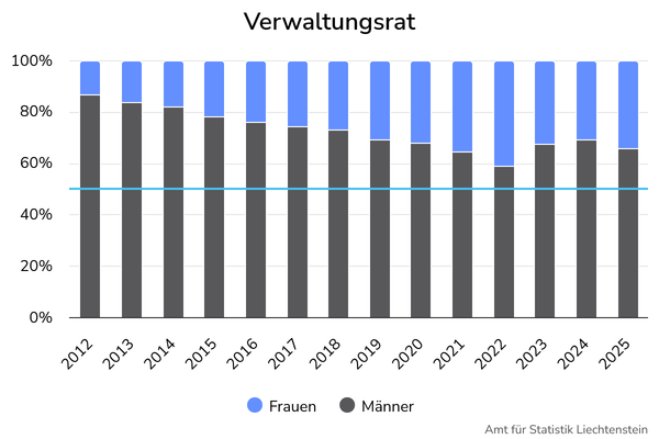 Der Frauenanteil unter den Mitgliedern der Verwaltungsräte der Anstalten und Privatunternehmen mit Landesbeteiligung ist seit 2012 bis 2022 kontinuierlich gestiegen. 2012 betrug der Anteil der Frauen 13.3%. Zwischen 2012 und 2022 hat sich der Anteil mehr als verdreifacht und betrug im Jahr 2022 41.1%. In der aktuellen Periode ist der Frauenanteil im Vergleich zum Vorjahr um 3.7 Prozentpunkte gestiegen und liegt bei 34.5%.