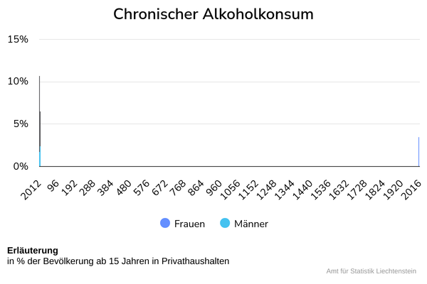 Der Indikator zeigt den Anteil der Frauen mit risikoreichem Alkoholkonsum und den Anteil der Männer mit risikoreichem Alkoholkonsum an der gesamten Bevölkerung an. Risikogruppe für chronischen Konsum sind jene mit mittlerem oder erhöhtem Risiko: Männer 4 Gläser und mehr, Frauen 2 Gläser und mehr eines alkoholischen Standardgetränks pro Tag. Die Daten sind mit dem 95% Vertrauensintervall dargestellt. Die Intervalle enthalten mit einer Wahrscheinlichkeit von 95% den tatsächlichen Wert der Grundgesamtheit.