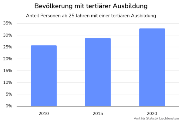 Der Anteil der Bevölkerung mit einer tertiären Ausbildung an der Gesamtbevölkerung (ab 25 Jahren mit Angaben zur höchsten abgeschlossenen Ausbildung) hat sich im Vergleich zum Bezugsjahr 2010 erhöht. Im Jahr 2020 besass ein Anteil von 32.9% einen Abschluss einer tertiären Ausbildung. Im Bezugsjahr 2010 waren dies 25.7% gewesen.