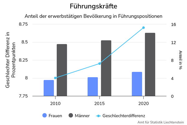 Der Anteil der erwerbstätigen Bevölkerung in Führungspositionen ist seit 2010 kontinuierlich angestiegen. Während im Bezugsjahr 2010 3.6% der weiblichen Erwerbstätigen Führungspositionen inne hatten, sind es 2020 5.4%. Auch bei den Männern ist ein Wachstum zu verzeichnen, welches aber zwischen 2010 und 2020 mit 2.5 Prozentpunkten grösser war als jenes der Frauen im selben Zeitraum. Das Wachstum auf weiblicher Seite liegt bei 1.6%. Im Jahr 2020 war der Anteil der erwerbstätigen Männer in Führungspositionen um 8.7 Prozentpunkte höher als der Anteil der erwerbstätigen Frauen in Führungspositionen. Im Bezugsjahr 2010 waren es 8.0 Prozentpunkte gewesen. Die Differenz zwischen den Geschlechtern hat sich somit erhöht.