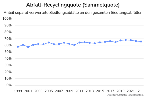 Die Abfall-Recyclingquote (Sammelquote) hat sich im Vergleich zum Bezugszeitraum 1999-2001 erhöht. Im Zeitraum 2021-2023 lag die Abfall-Recyclingquote durchschnittlich bei 66.5%. Im Bezugszeitraum 1999-2001 hatte die Abfall-Recyclingquote 58.6% betragen.
